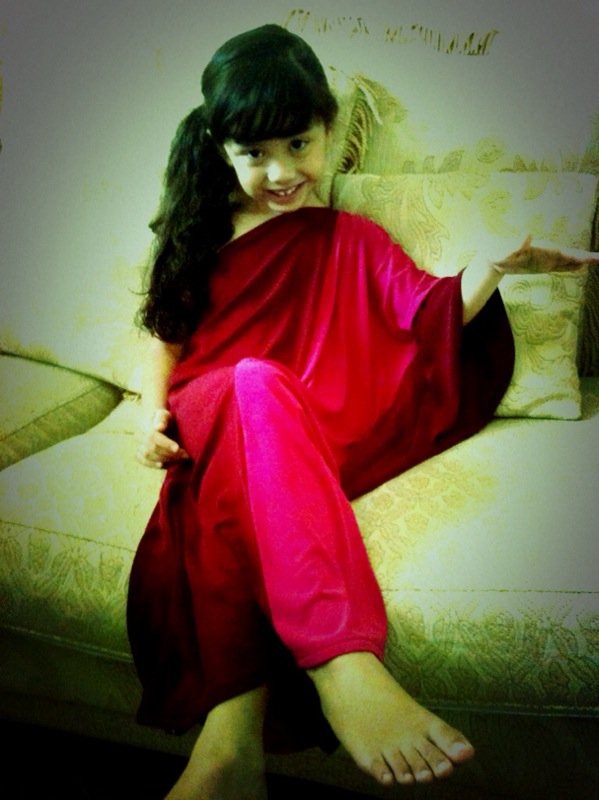 Class party = no need to wear uniform and again, she has requested for a 2nd mini toga dress and specifically instructed to her Tok Mommy that this time her toga dress consist of maroon and pink. -____-
